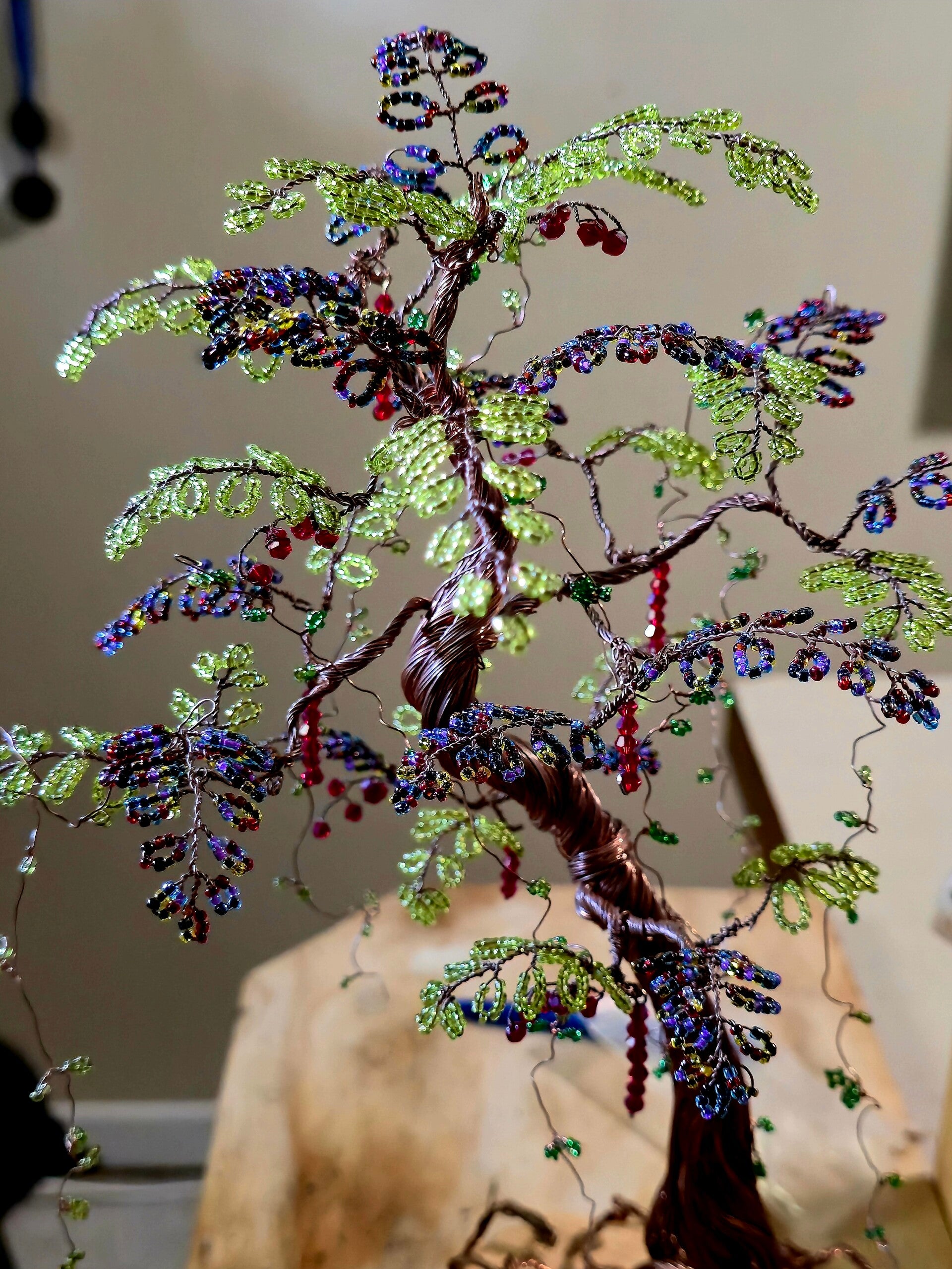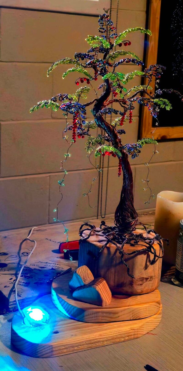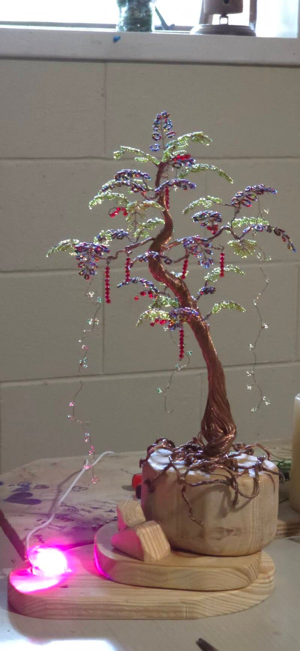 beautiful handcrafted copper tree fitted with our hand crafted L. E. D Lights
